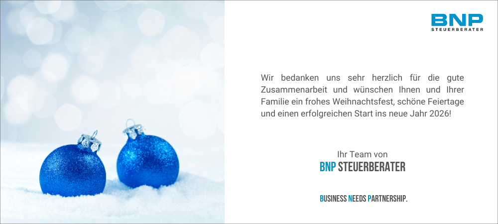 Redaktion: BNP Steuerberater. Alle Angaben in dieser Klienten-Information dienen nur der Erstinformation, enthalten keinerlei Rechts- oder Steuerberatung und können diese auch nicht ersetzen; jede Gewährleistung und Haftung ist ausgeschlossen. Bitte informieren Sie Ihren Berater, wenn Sie die Übermittlung der Klienten-Information auch an andere Personen in Ihrem Unternehmen wünschen oder falls Sie diese Nachricht nicht mehr erhalten möchten. Detaillierte Informationen zu unserer Datenschutz-Leitlinie sowie unserer Datenschutzerklärung finden Sie auf unserer Homepage www.bnp.at. Erstellung: 10.12.2025